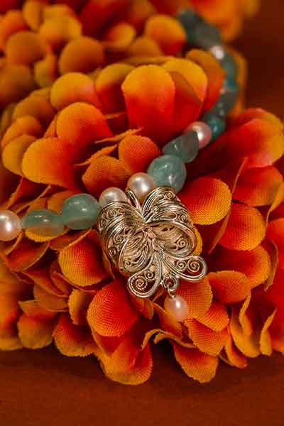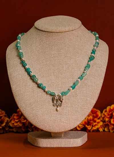 Por ejemplo, el collar en amazonita y perlas es el accesorio que mejor traduce la elegancia. Su dije hecho a mano en filigrana añade un toque etéreo y romántico.