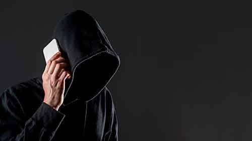 Vista lateral del pirata informático masculino hablando por teléfono inteligente.